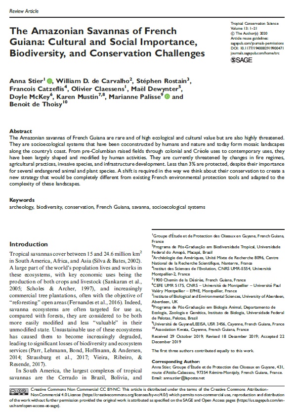 Découvrez un nouvel article scientifique publié dans Tropical Conservation Science (en anglais) qui résume les connaissances actuelles sur l’importance culturelle et sociale, mais également sur l’écologie des savanes guyanaises. Il souligne le fait que ces savanes sont à l’heure actuelle encore largement méconnues, mais également menacées et sous-protégées.